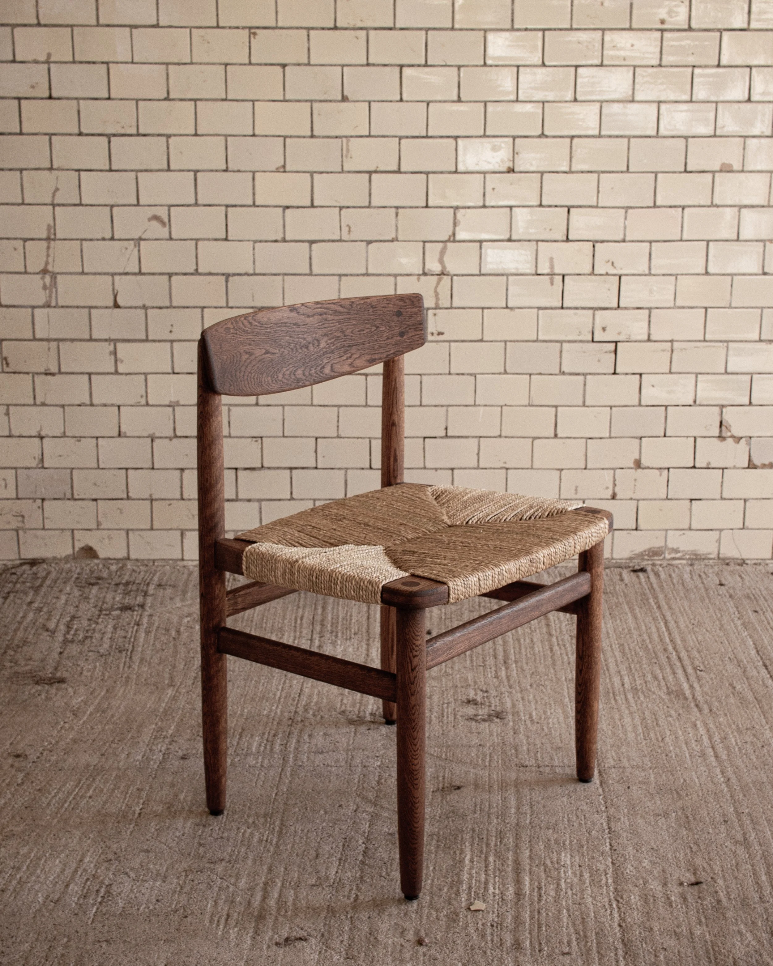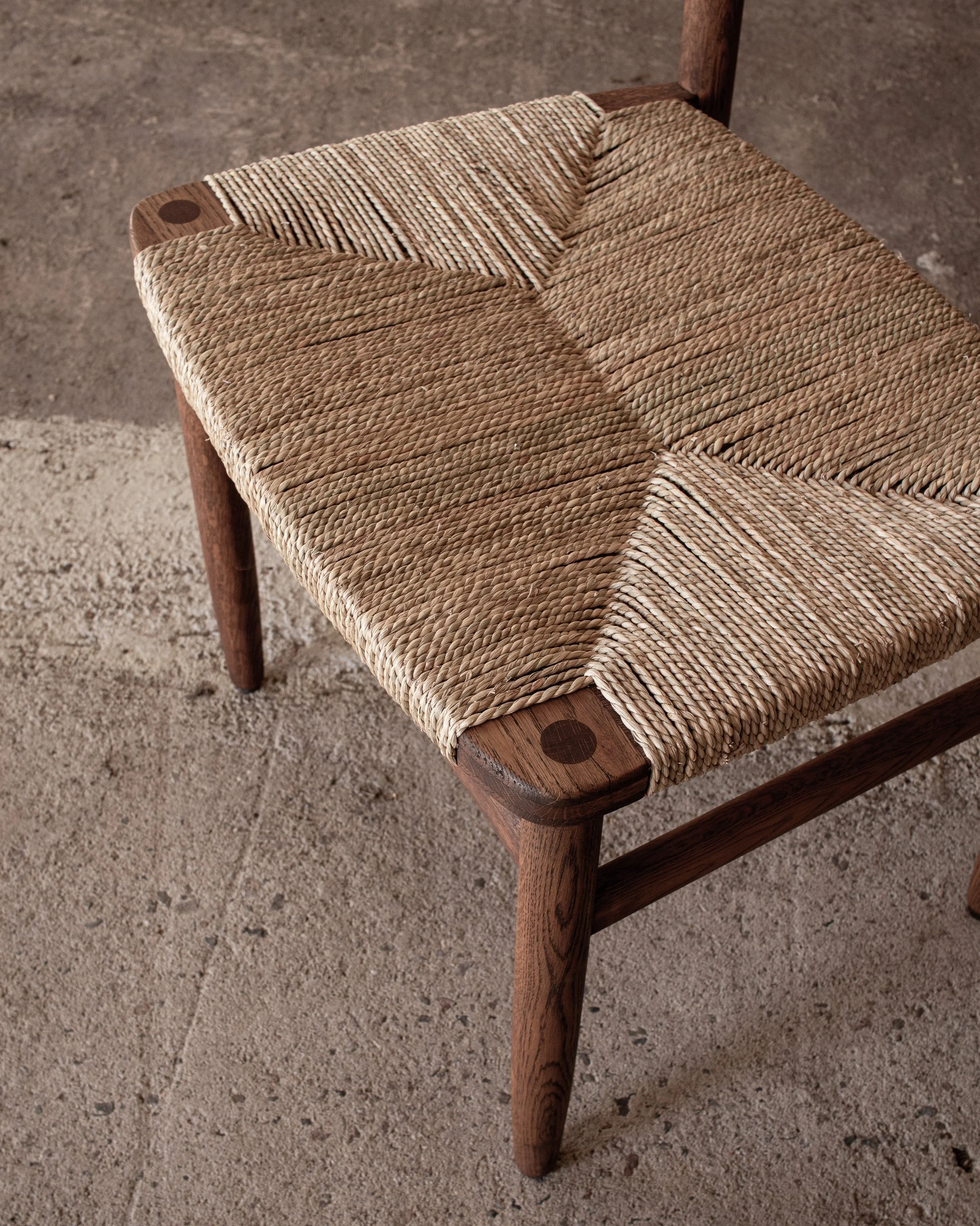 Sanded down and treated with tinted dark oil and new rush seaweed seats.