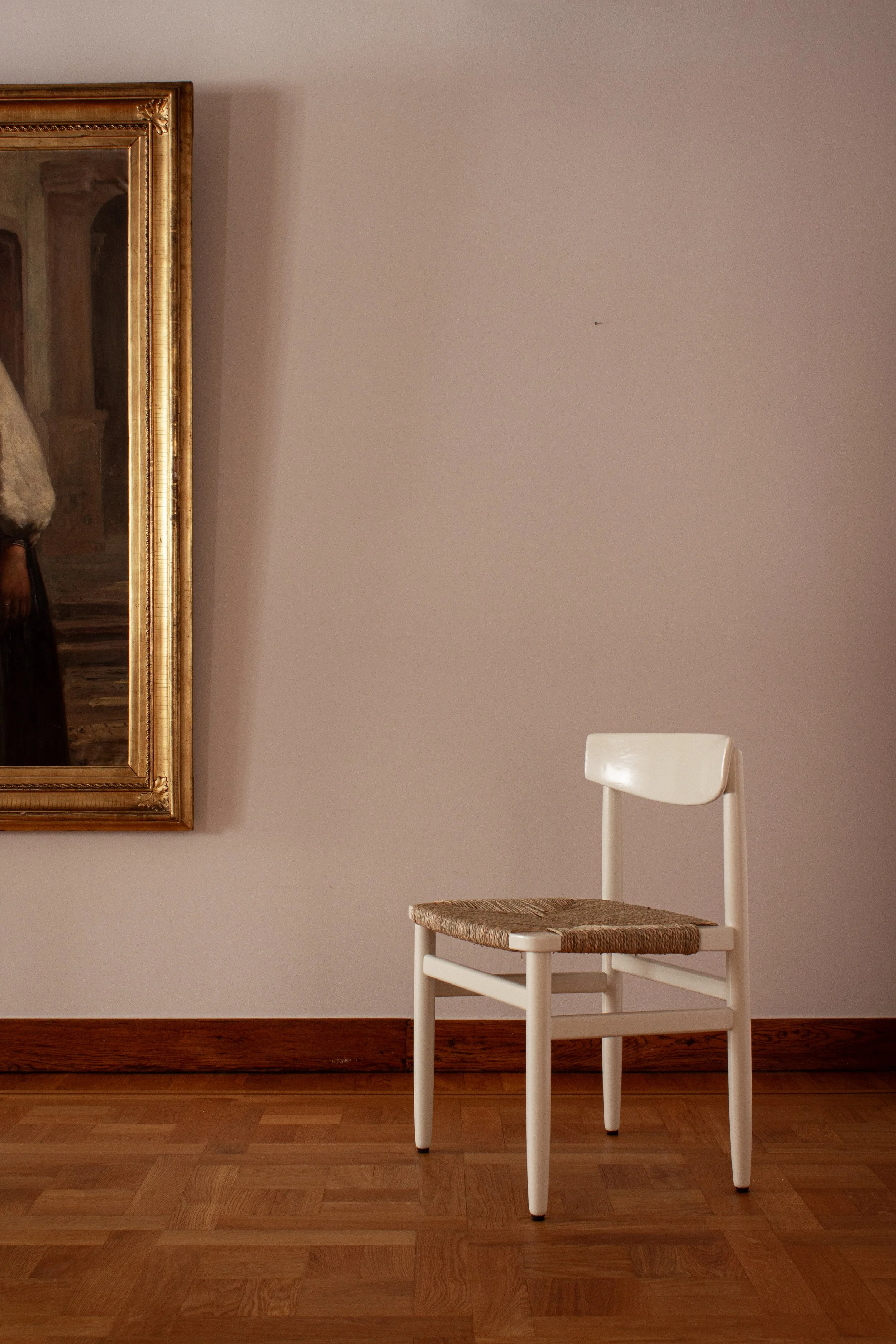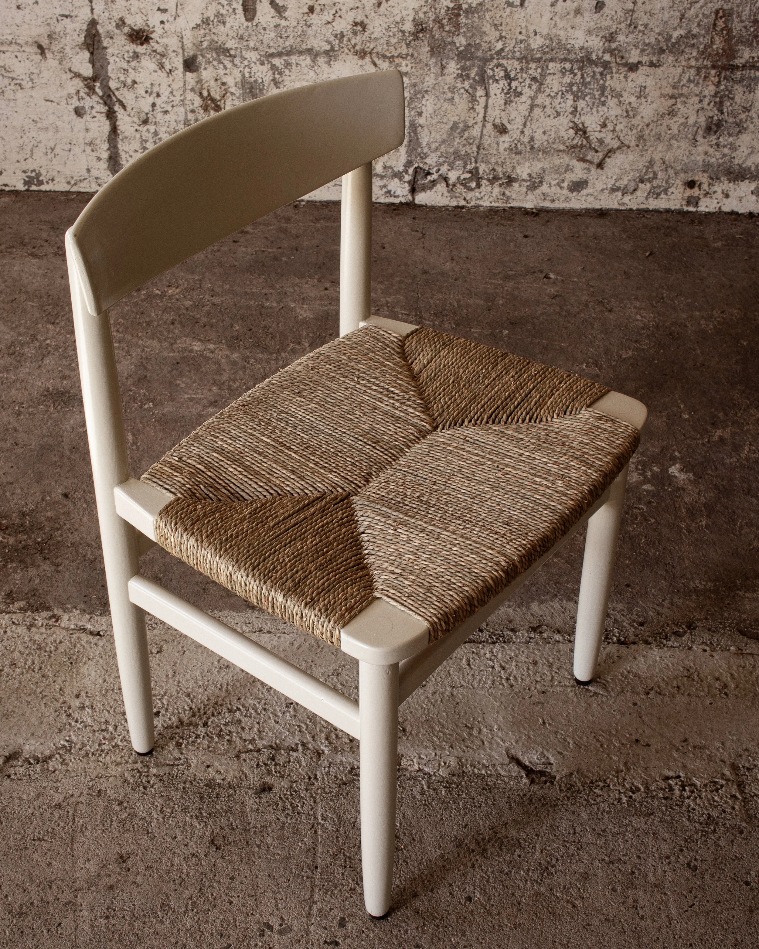 Repainted in a warm white color and a new rush seat.