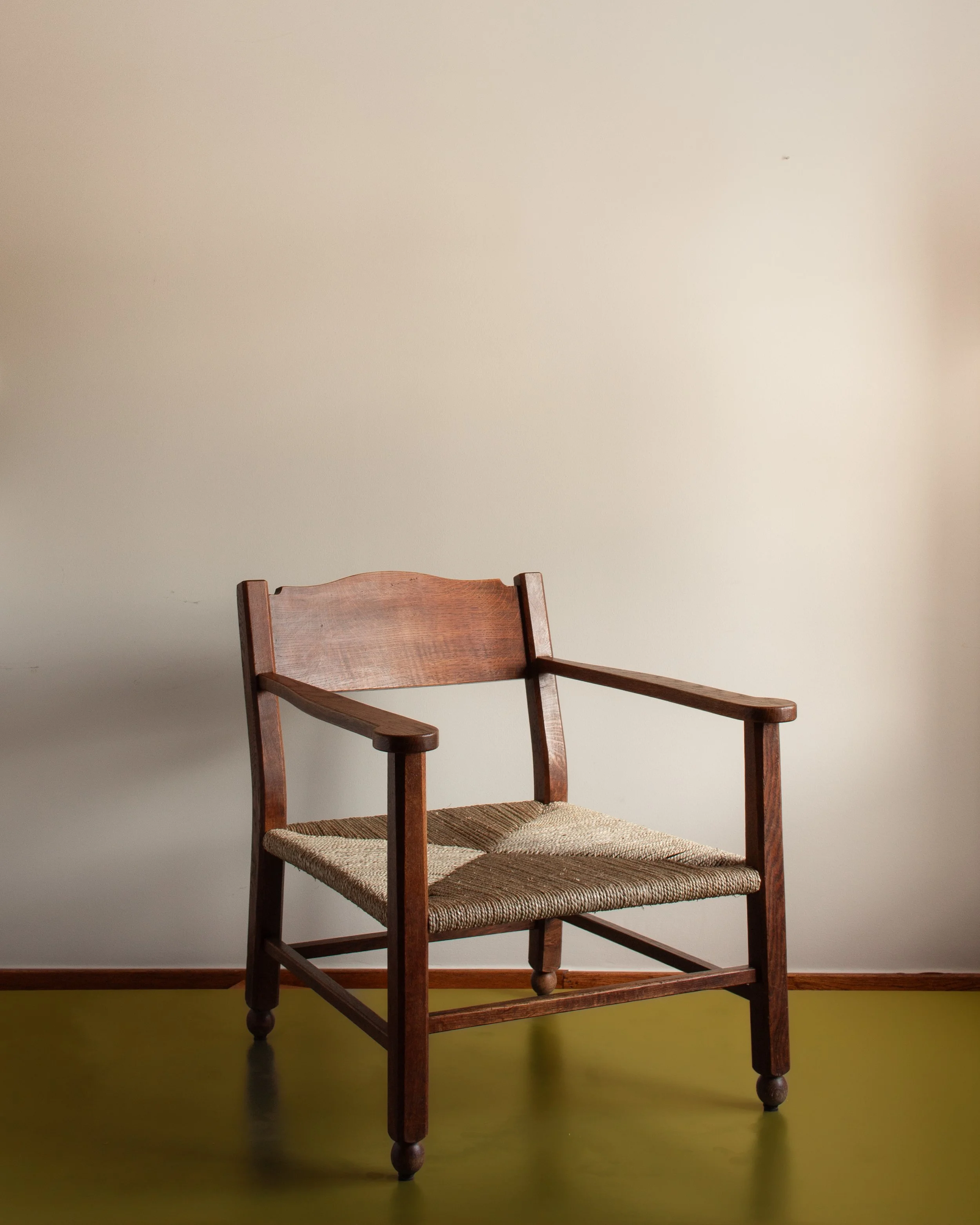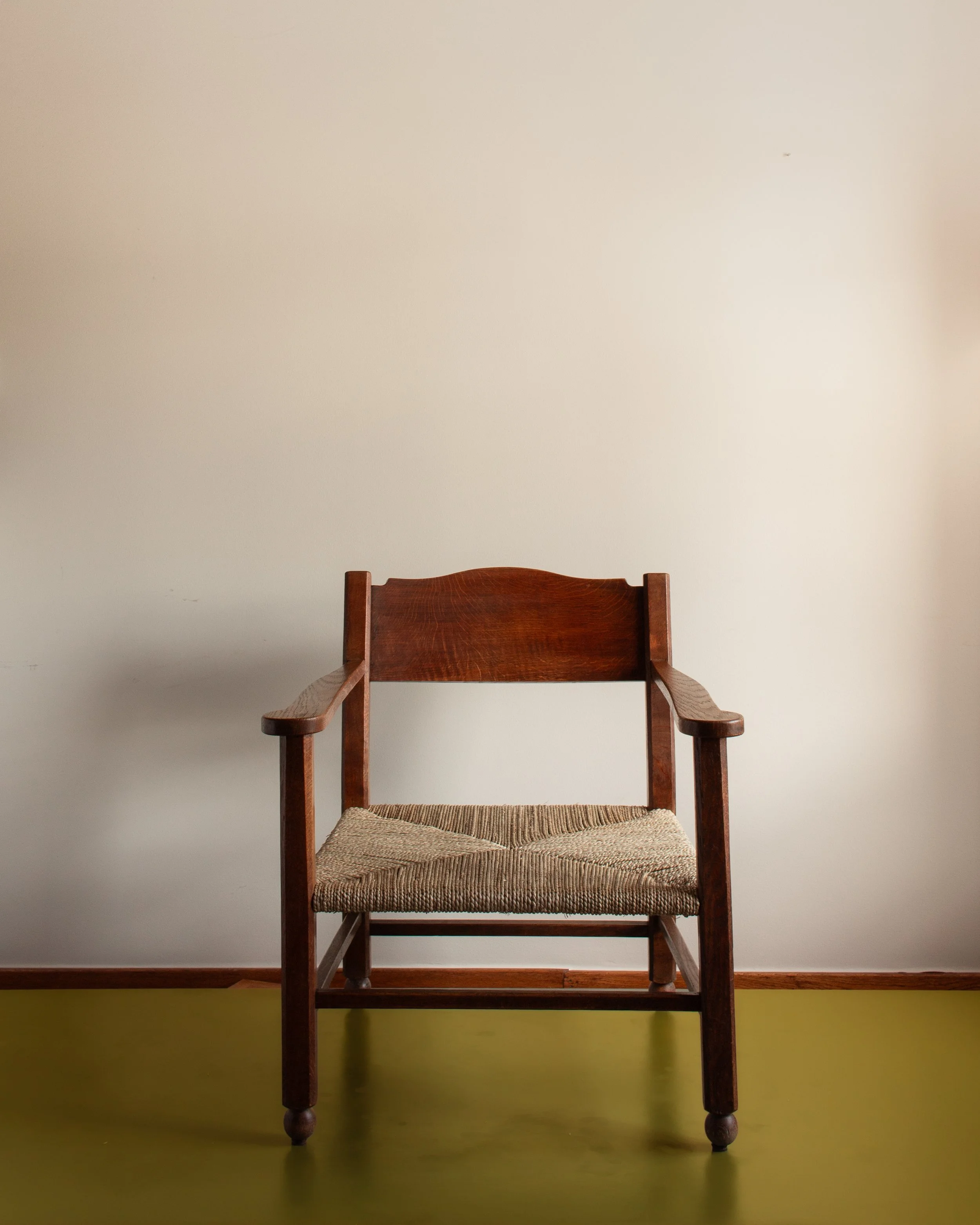 Deep oak armchair, new seaweed rush seat, Scandinavia, mid 20th century.